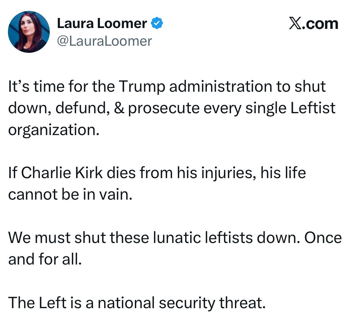 «È ora che l’amministrazione Trump chiuda, tolga i fondi e persegua ogni singola organizzazione di sinistra», ha twittato Laura Loomer, la provocatrice dell’estrema destra che notoriamente ha l’orecchio di Trump. In un tweet separato ha continuato: «Ogni gruppo di sinistra che finanzia proteste violente deve essere chiuso e perseguito. Nessuna pietà. In prigione ogni singolo uomo di sinistra che fa una minaccia di violenza politica».