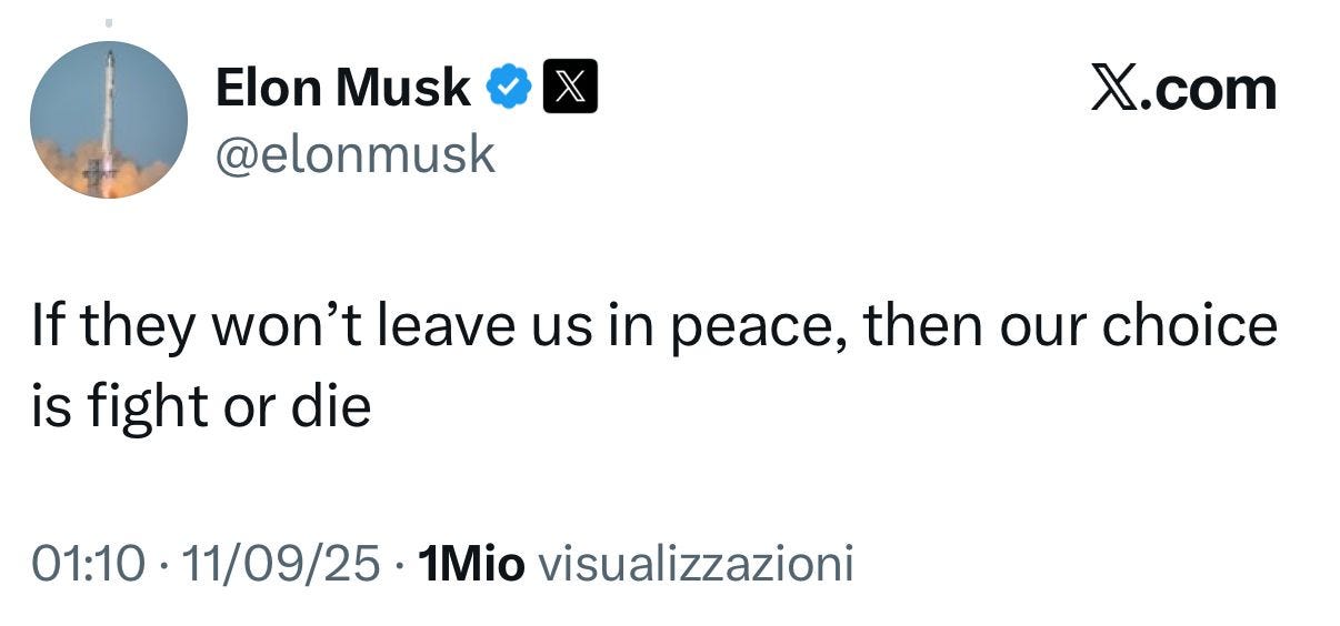 “Se non ci lasceranno in pace”, ha scritto Elon Musk, “allora la nostra scelta è combattere o morire.”